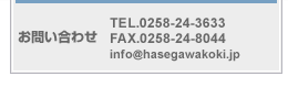 | 所在地 | 新潟県長岡市東高見1-2-15 TEL.0258-24-3633 FAX.0258-24-8044 E-mail:info@hasegawakoki.jp |