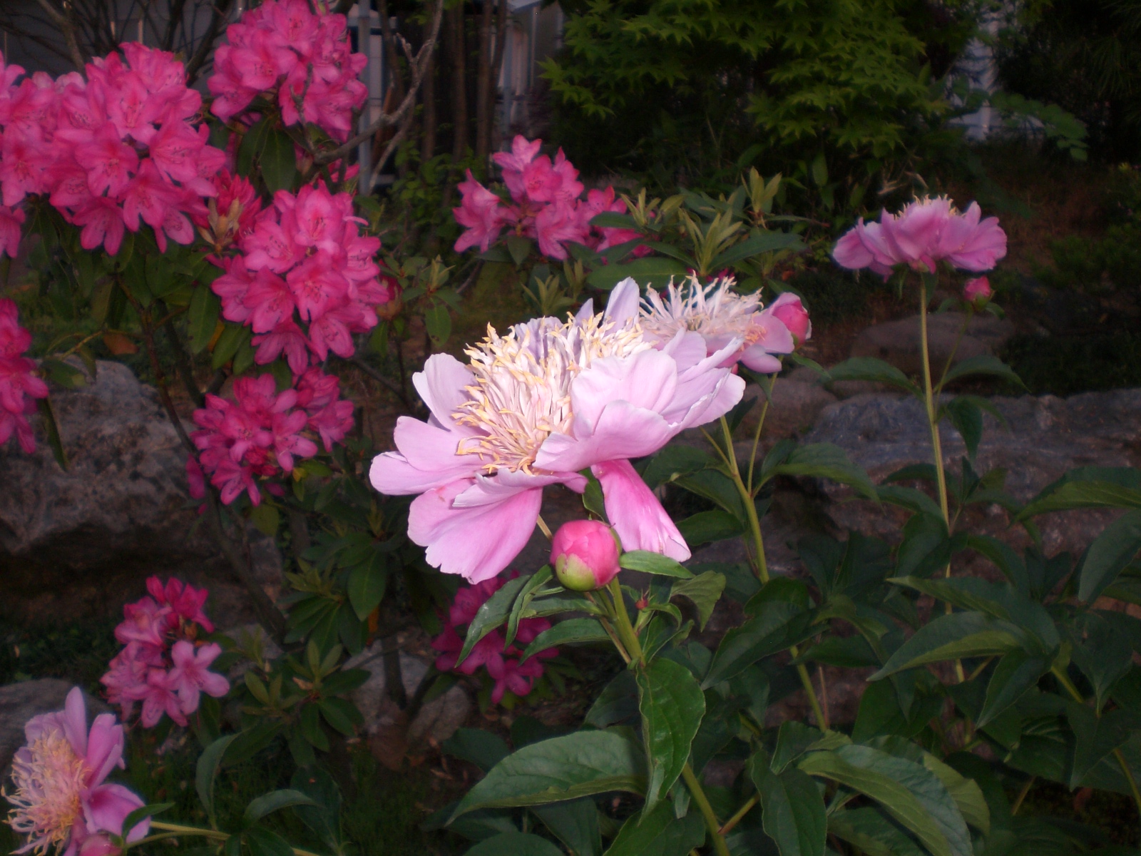 29日が見ごろだったボタンはシャッターチャンスを逃してしまい完全に開ききりました。となりのシャクナゲはいい感じ(見頃)です。庭の裏の方ではバラも咲いていました。月末の忙しさにかまけて、庭の観賞どころではありませんでした。