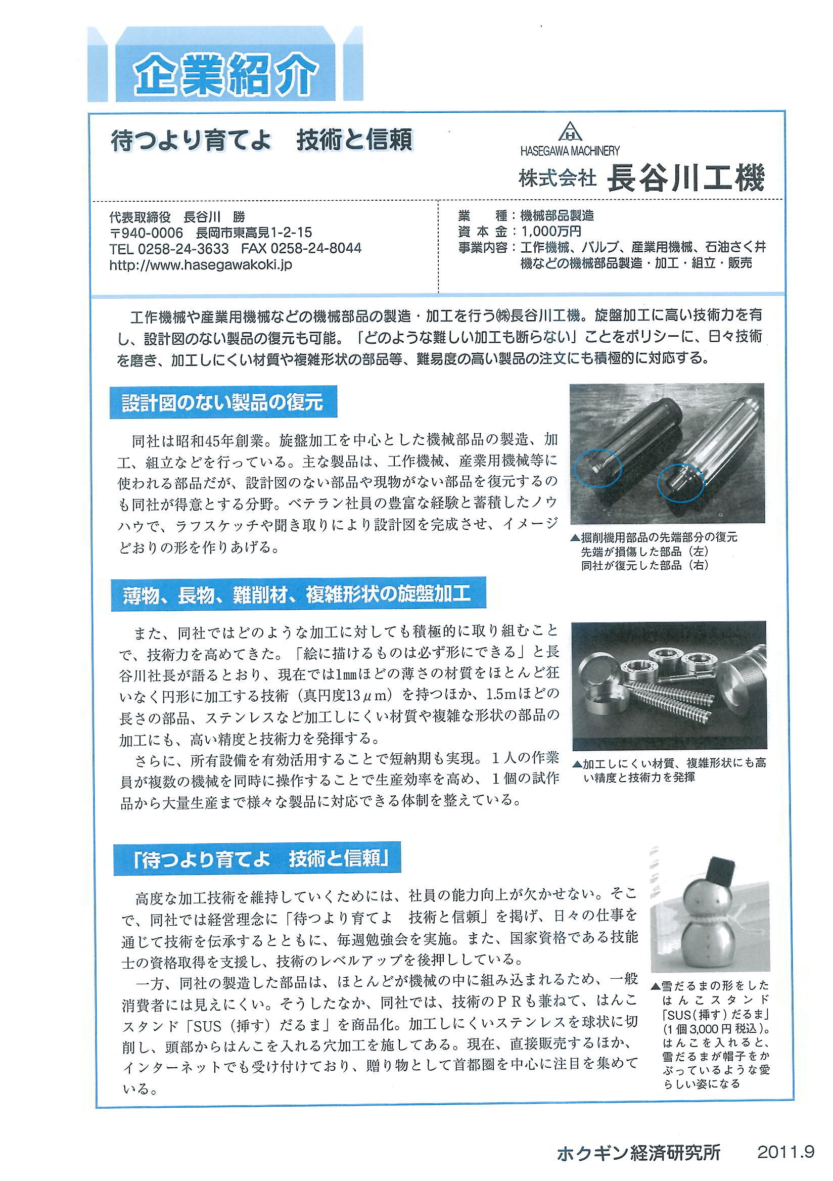 6月下旬に行なわれた取材が9月号の紙面に掲載いただきました。 企業紹介のページです。 「設計図のない製品の復元」 「薄物、長物、難削材、複雑形状の旋盤加工」 「待つより育てよ 技術と信頼」 の三つの見出しで紹介されました。 お時間のある方はご覧ください。